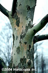 The London Sycamore tree, Platanus Acerifolia, or "Bloodgood Sycamore" is a large tree. The tree will reach a height of 85 feet and a spread of 70 feet. Pyramidal in youth, it develops a spreading rounded crown with age supported by a few, very large diameter branches. The bark is patchy and very attractive and may be the plants best ornamental attribute. These patches range from creamy-white to olive-green. Large sections of bark may be shed from the tree as it grows older.